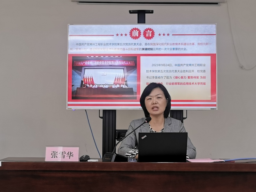 张雪华从大会召开的背景、意义、深入领会大会的主题、公司五年来取得的重要成就、过去五年的宝贵经验、创建全国有特色、行业能领军的应用技术大学的重要意义、今后五年公司工作的指导思想、今后五年公司工作的发展目标、今后五年公司工作的重点任务部署、公司党风廉政建设取得的新进展和今后五年的工作任务等方面为大家作了全面系统的讲解。在场全体师生加深了对公司第五次党代会精神理解,增强了高质量做好公司各项工作的信心。