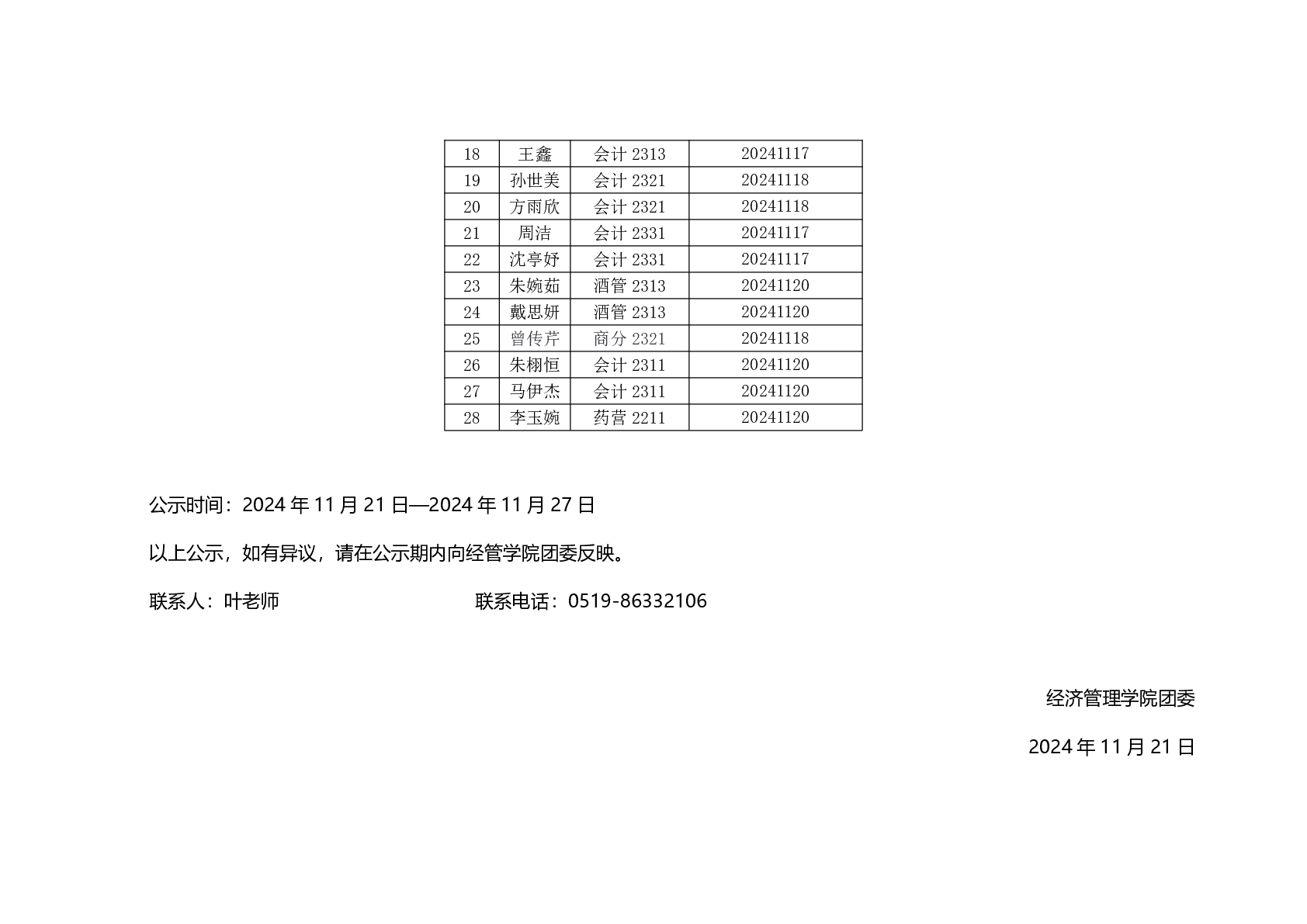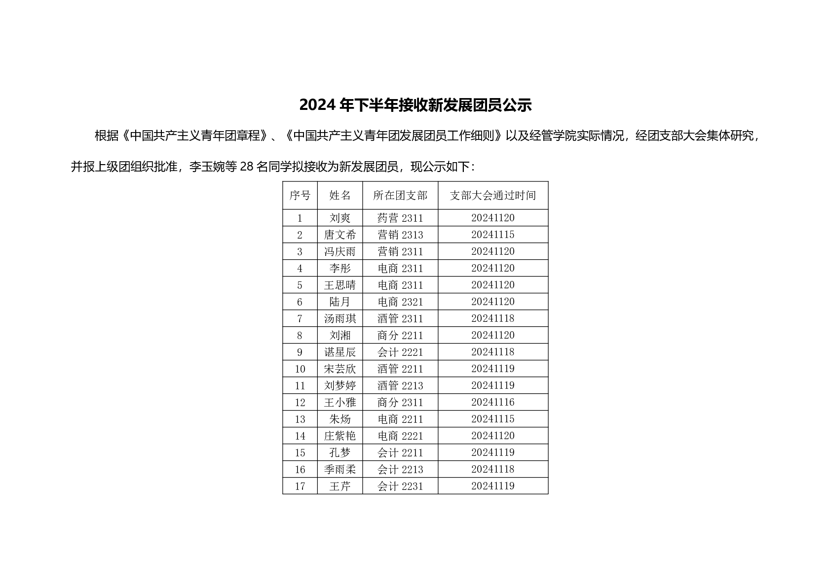 2024年下半年接收新发展团员公示